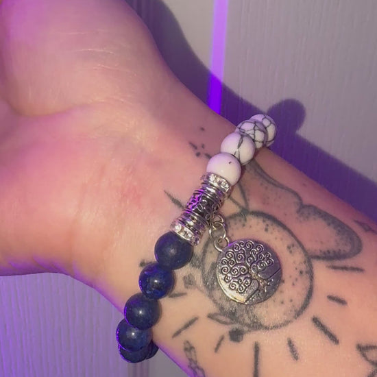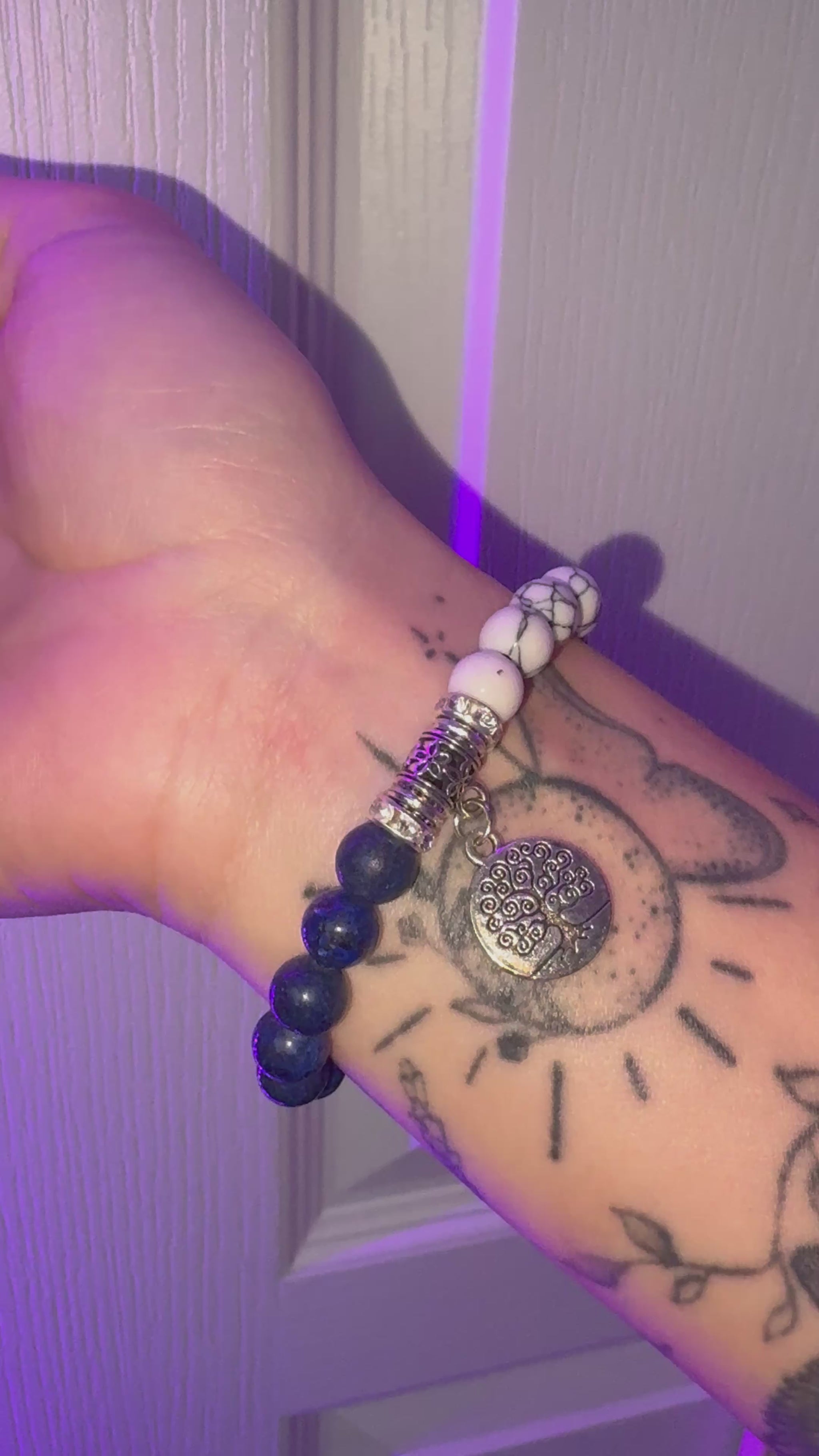 This piece is one of my half and half, yen and yang styled bracelets. One half is made of Howlite beads, with the other half is Sodalite. they are joined in the middle with a tree charm:)